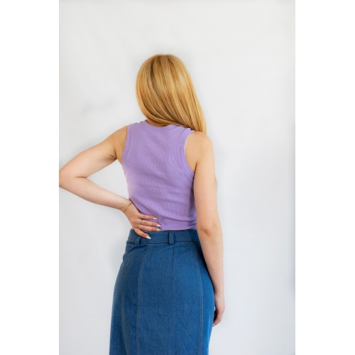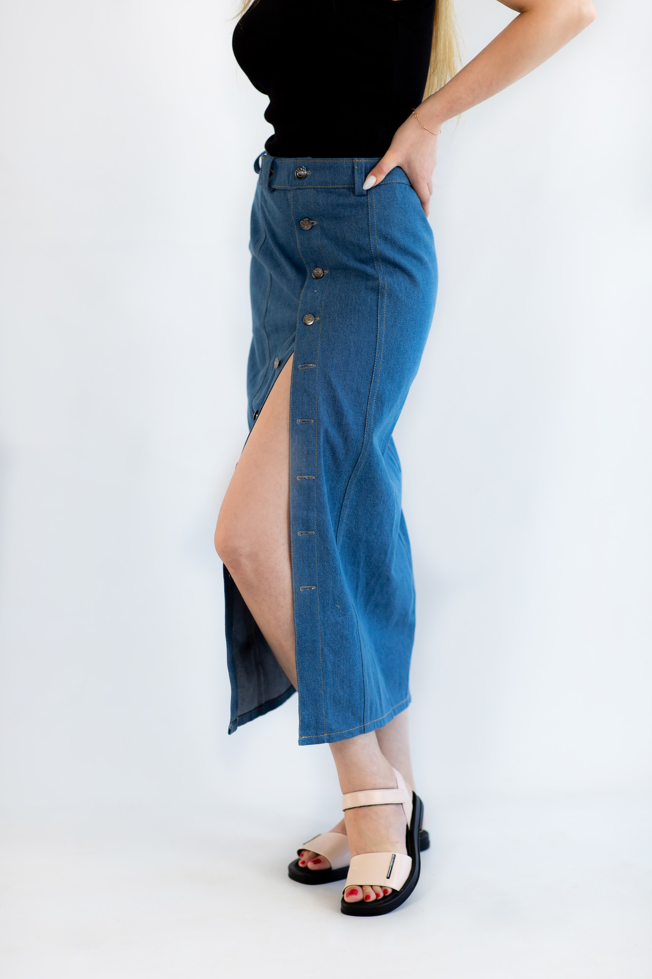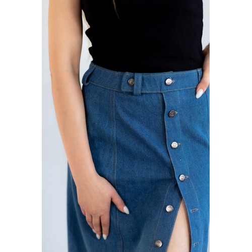 Стильна джинсова жіноча спідниця міді, має застібку на ґудзиках