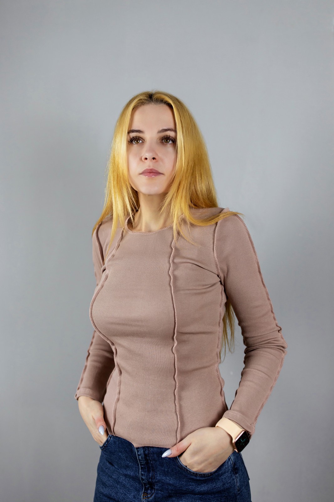 Жіноча кофта зі швами на виворіт, тканина рубчик . У кольорах : синій , беж . Приталений крій.